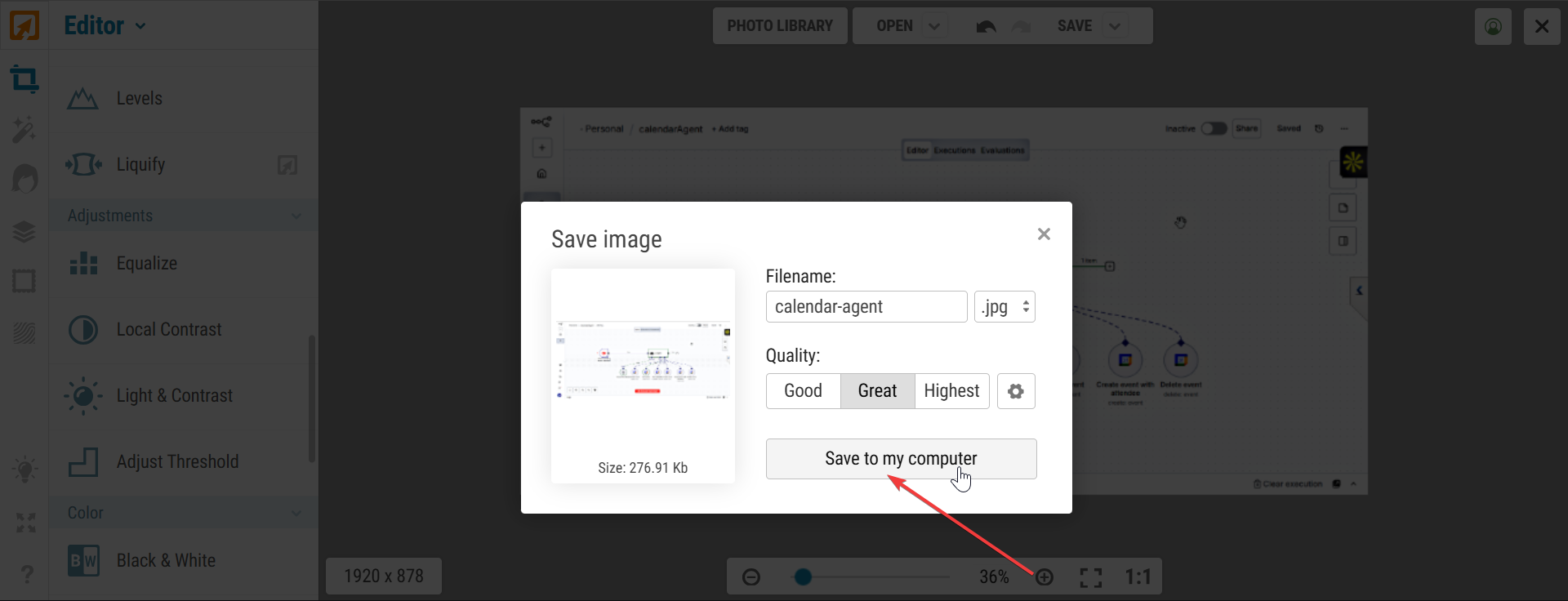 iPiccy ให้คุณส่งออกเป็น JPG หรือ PNG โดยไม่มีลายน้ำ คุณสามารถดาวน์โหลดรูปภาพลงในอุปกรณ์ของคุณได้โดยตรงหรือจัดเก็บไว้ในบัญชีของคุณเพื่อการแก้ไขในภายหลัง