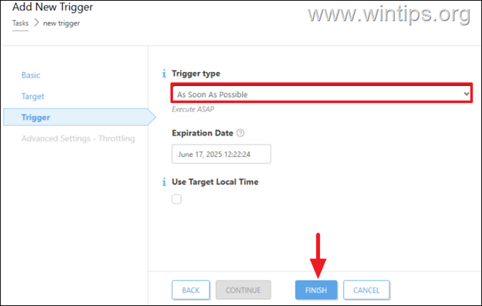 6. ตอนนี้เลือกใช้ทริกเกอร์”โดยเร็วที่สุด“เพื่อใช้ทริกเกอร์ทันที (หรือกำหนดเวลาในภายหลังหากคุณต้องการ) แล้วคลิก เสร็จสิ้น