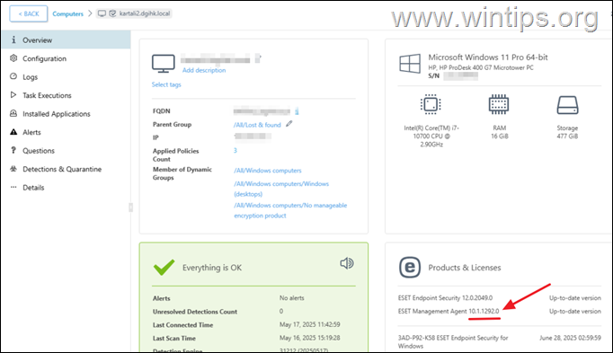4. จากนั้น เปิดรายละเอียดของคอมพิวเตอร์ที่ใช้นโยบาย ESET และตรวจสอบเวอร์ชัน ESET Management Agent ที่นั่นด้วย