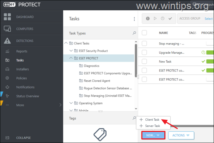 1. ในแดชบอร์ด ESET PROTECT เลือก งาน > ใหม่ > งานไคลเอนต์