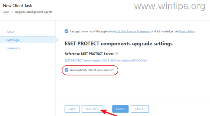 2c. ตอนนี้เลือกว่าคุณต้องการรีบูตเครื่องไคลเอนต์โดยอัตโนมัติหลังจาก อัปเกรดแล้วคลิก ดำเนินการต่อ
