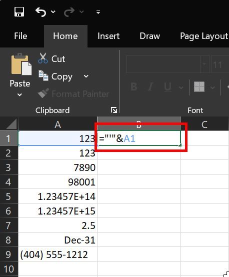 หากคุณต้องการแก้ไขเซลล์สองสามเซลล์เพื่อเติมเครื่องหมายอะพอสทรอฟี่เป็นตัวเลข คุณสามารถทำได้ด้วยตนเอง ไม่ต้องการสูตรแฟนซีใดๆ สิ่งที่คุณต้องทำคือดับเบิลคลิกเซลล์ วางเคอร์เซอร์ข้อความที่จุดเริ่มต้นของตัวเลข (เคล็ดลับ: กดปุ่ม’Home’) แล้วกดปุ่มเครื่องหมายอะพอสทรอฟีบนแป้นพิมพ์