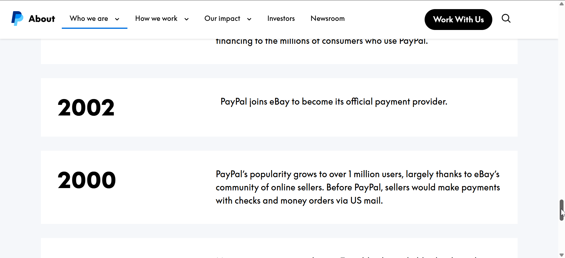 eBay เป็นเจ้าของ PayPal มานานกว่าทศวรรษและใช้เป็นเครื่องมือการชำระเงินที่สำคัญ ช่วงเวลาดังกล่าวได้รวม PayPal เข้ากับผู้ให้บริการการชำระเงินรายใหญ่ของสหรัฐอเมริกา ในขณะเดียวกันก็กำหนดโครงสร้างองค์กรในช่วงแรก