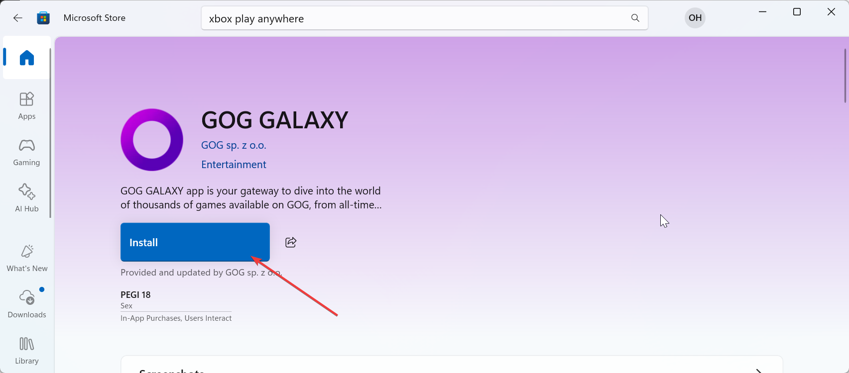 ใช้วิธีนี้เมื่อแอป Xbox ไม่รีเฟรชใบอนุญาตของคุณ เปิด Microsoft Store จากเมนู Start และค้นหาชื่อ Play Anywhere ของคุณ จากนั้นคลิกรับเพื่อเริ่มการดาวน์โหลด