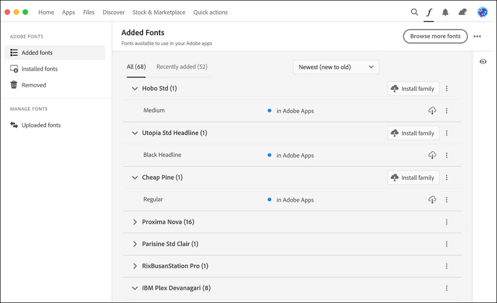 เปิดแอป Creative Cloud และเลือก แบบอักษร บนแผงด้านซ้าย เรียกดูรายการแบบอักษรและเลือกแบบอักษรที่คุณต้องการ สุดท้ายคลิกปุ่มเพิ่มครอบครัว