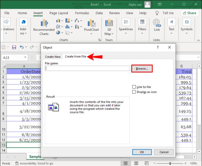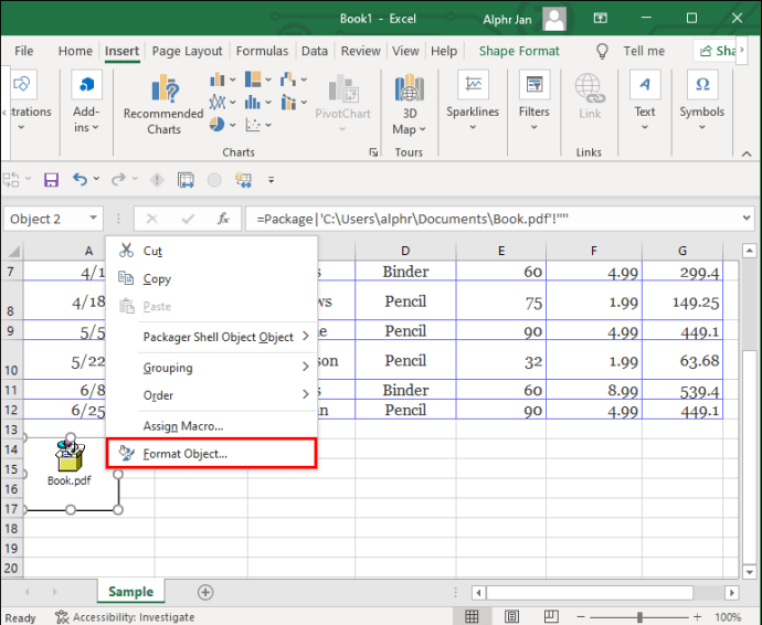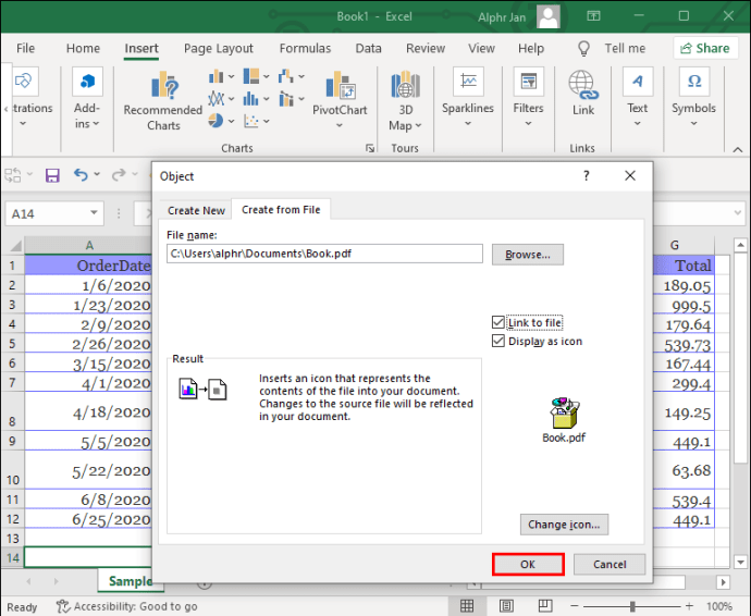 การฝัง PDF ลงในสเปรดชีต Excel ใน Windows นั้นง่ายกว่าการลงมือทำ บน Mac Windows 7, 8, 8.1, 10, 11 และอื่น ๆ อนุญาตให้ใช้วัตถุ OLE ดังนั้นคุณสามารถใช้ตัวเลือก”แทรก-> วัตถุ”ไม่เหมือนกับบน Mac คุณสามารถอนุญาตให้รูปภาพอัปเดตเหมือนกับไฟล์ได้หากต้องการ อย่างไรก็ตาม ตัวเลือกนั้นมีความเสี่ยงด้านความปลอดภัย ดังนั้นส่วนใหญ่จึงปล่อยภาพขนาดย่อไว้และเรียกมันว่าวันนั้น ต่อไปนี้เป็นวิธีฝัง PDF ลงใน Excel บน Windows