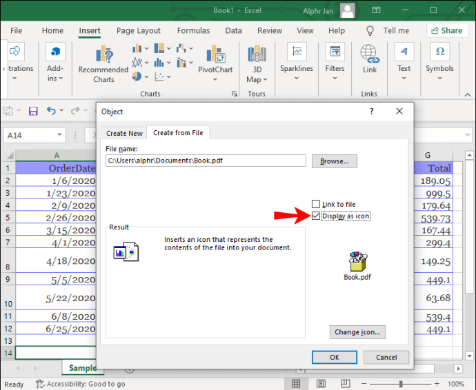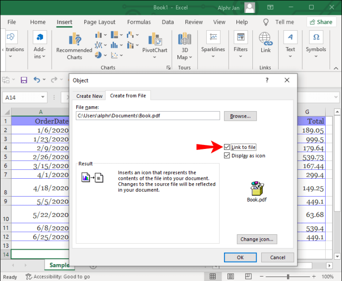Excel อนุญาตให้รวมไฟล์ต้นฉบับสำหรับการอ้างอิง พร้อมตัวเลือกเพิ่มเติมในการฝังไฟล์ รองรับประเภทไฟล์ยอดนิยมรวมถึง PDF คุณจะมีตัวเลือกในการแสดงไฟล์เป็นไอคอนหรือการแสดงตัวอย่าง คุณยังสามารถสร้างลิงก์ไปยังไฟล์ต้นฉบับเพื่อให้การเปลี่ยนแปลงใดๆ ที่เกิดขึ้นมีผลในเวอร์ชันที่ฝัง