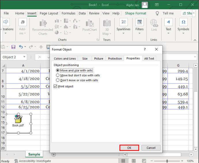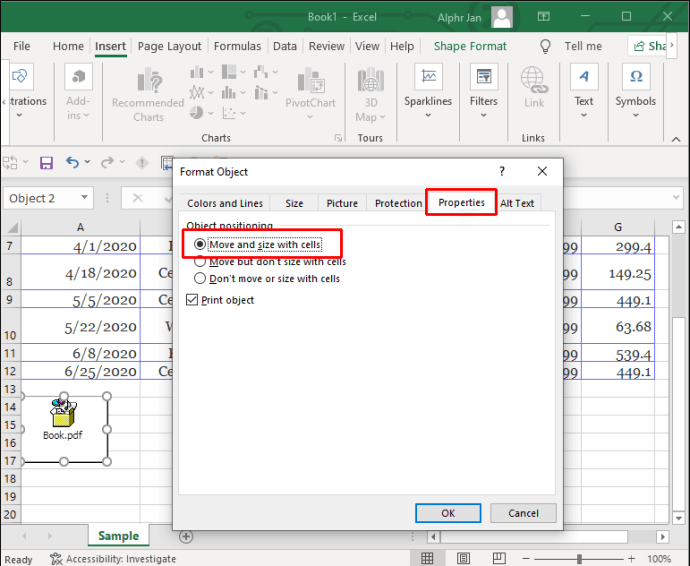ตามค่าเริ่มต้น ไอคอนจะแสดงที่ด้านบนสุดของเซลล์ Excel ของคุณ เพื่อให้แน่ใจว่าปรับขนาดอัตโนมัติและปรับให้เข้ากับคอลัมน์ที่ปรับขนาดใหม่ ให้ทำดังต่อไปนี้: กดไฟล์ PDF ค้างไว้ จากนั้นเลือก “จัดรูปแบบวัตถุ…”เลือกแท็บ “คุณสมบัติ” และเลือกตัวเลือก “ย้ายและปรับขนาดด้วยเซลล์” แตะ”ตกลง”เพื่อใช้การเปลี่ยนแปลง