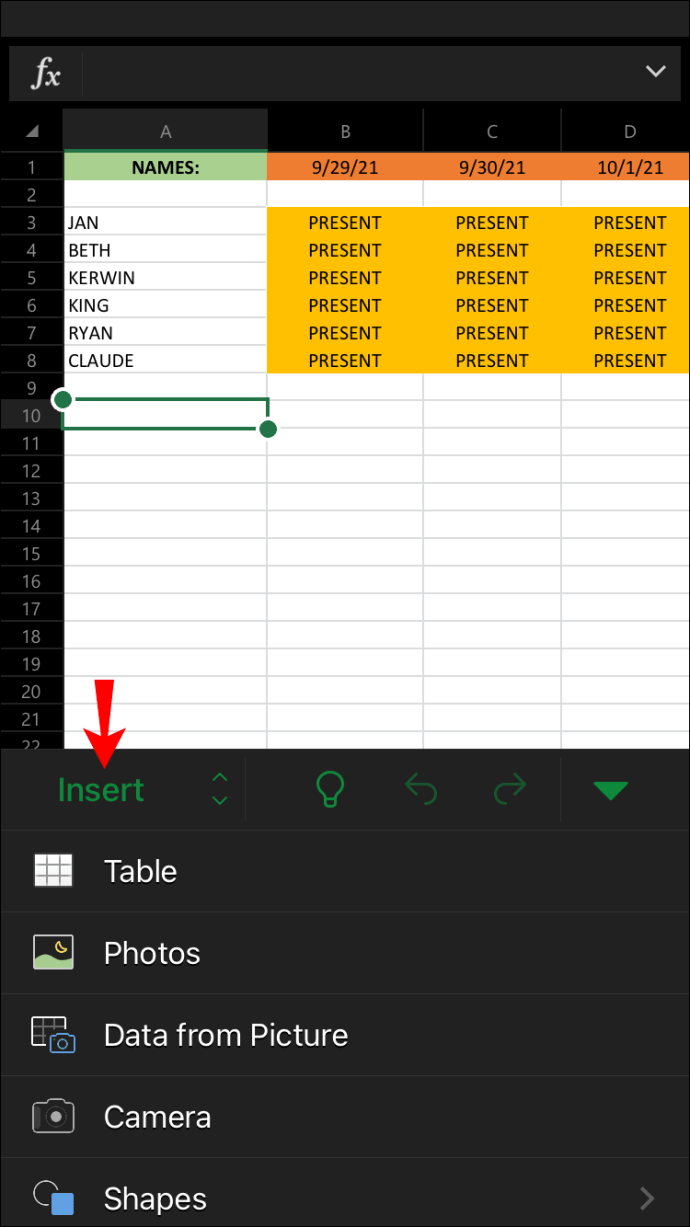 ทำตามขั้นตอนเหล่านี้เพื่อฝังไฟล์ PDF ลงในสเปรดชีตของคุณผ่านแอป Excel สำหรับ iOS: