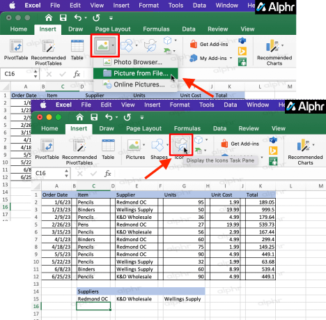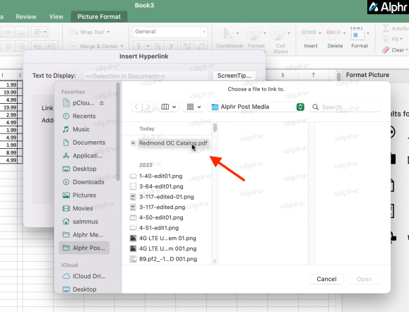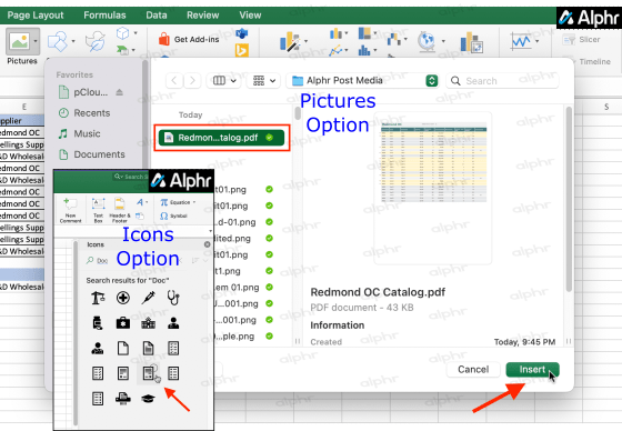 ตัวเลือกที่เราค้นพบช่วยให้ คุณแทรกรูปภาพหรือไอคอนเป็นไฟล์แล้วเพิ่มลิงก์เข้าไป โดยทำสิ่งเดียวกับการแทรกวัตถุ PDF ข้อแตกต่างเพียงอย่างเดียวคือคุณต้องสร้างรูปขนาดย่อ (การสร้างทั่วไปหรือภาพหน้าจอ) เลือกใช้รูปภาพจากไฟล์ หรือเรียกดูรูปภาพทั่วไปในไลบรารีของ Office ทำตามขั้นตอนด้านล่างเพื่อเพิ่มไฟล์ PDF ลงในสเปรดชีต Excel บน macOS