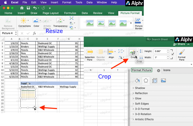 ปรับขนาดรูปภาพให้พอดีกับสเปรดชีตของคุณ คุณยังสามารถครอบตัดเพื่อลบช่องว่างออก