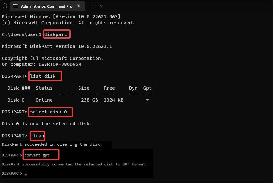 เปิด Command Prompt พร้อมสิทธิ์พิเศษ ป้อน diskpart แล้วกด Enter ตอนนี้เข้าสู่รายการดิสก์ คำสั่งนี้จะแสดงรายการพาร์ติชันของดิสก์ในคอมพิวเตอร์ของคุณ จดบันทึกปริมาณที่คุณต้องการแปลง จากนั้นพิมพ์เลือกดิสก์ 0 ดิสก์ที่เรากำลังพยายามแปลงนี่คือ ดิสก์ 0 แทนที่ด้วยชื่อดิสก์ที่คุณระบุไว้ก่อนหน้านี้ ตอนนี้ป้อนที่สะอาด การดำเนินการนี้จะลบพาร์ติชันทั้งหมดในดิสก์