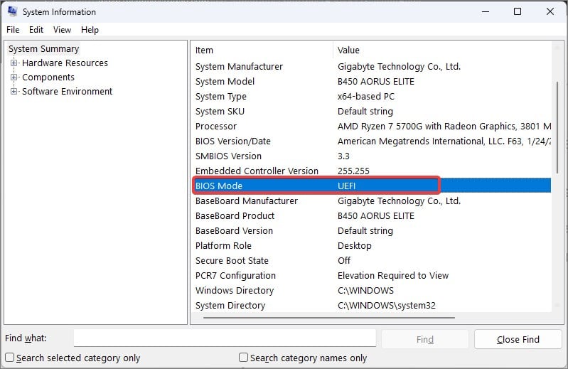 เปิด Run พิมพ์ msinfo32 แล้วกด Enter เพื่อเปิด ข้อมูลระบบ ในข้อมูลสรุปของระบบ ให้ตรวจสอบฟิลด์โหมด BIOS หากมีการพูดถึง UEFI คุณสามารถดำเนินการเปิดใช้การบู๊ตที่ปลอดภัยได้