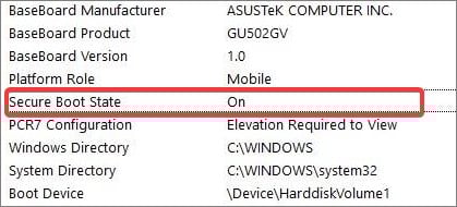 กด Windows Key + R พิมพ์ msinfo32 แล้วกด Enter จะเป็นการเปิดหน้าต่าง ข้อมูลระบบ ใต้ ข้อมูลสรุปของระบบ ให้หา Secure Boot State หากมีป้ายกำกับว่า ปิด ระบบจะปิดใช้ Secure Boot บนอุปกรณ์