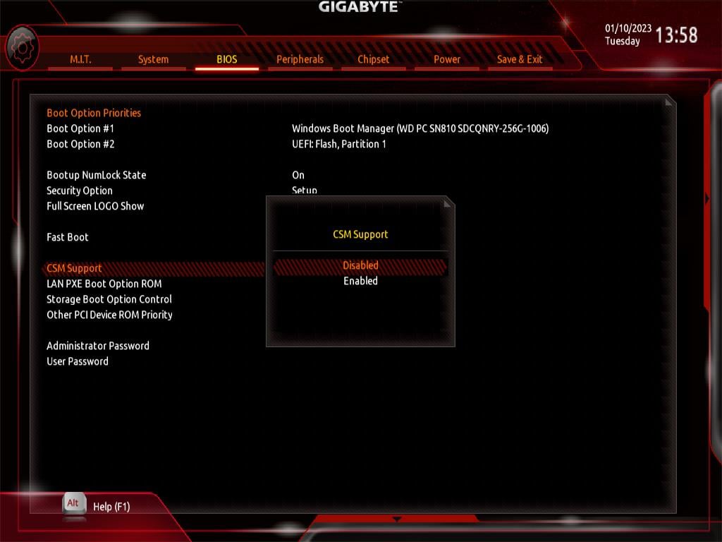 หากต้องการปิดใช้งาน CSM บนอุปกรณ์ Gigabyte