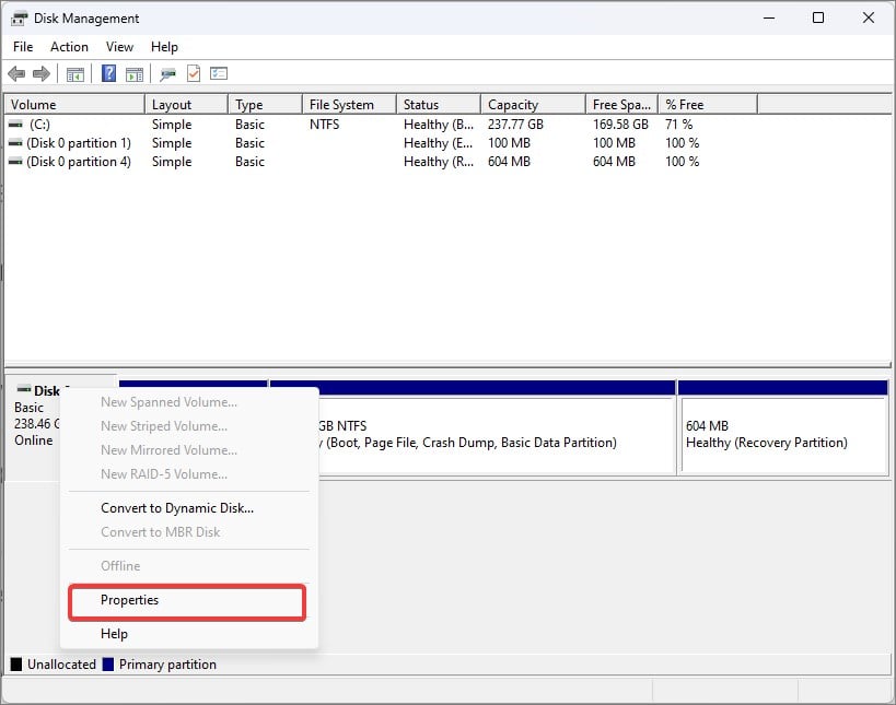 กด Windows Key + X แล้วเปิด การจัดการดิสก์ คลิกขวาที่ดิสก์แล้วเลือกคุณสมบัติ