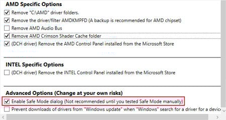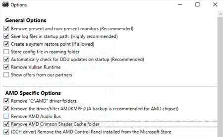 หลังจากที่พีซีของคุณบู๊ตในเซฟโหมด ให้เปิด DDU และ เลือก ตัวเลือก จากแถบเมนู ภายใต้ตัวเลือกทั่วไป ให้เลือก สร้างจุดคืนค่าระบบ ลบ Vulkan Runtime และ ตัวเลือกที่แนะนำทั้งหมด ใต้ตัวเลือกเฉพาะสำหรับ GPU ให้เลือกตัวเลือกทั้งหมด ยกเว้นการลบไดรเวอร์บัส