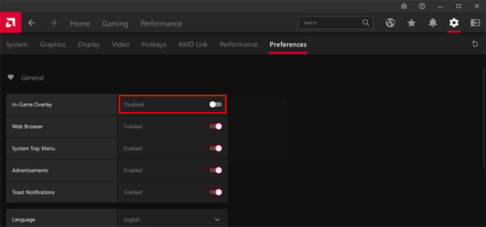 เปิด Radeon Software Adrenalin Edition ไปที่ การตั้งค่า (ไอคอนรูปเฟือง) จากนั้นไปที่ ทั่วไป ภายใต้ค่ากำหนด ให้ปิด โอเวอร์เลย์ในเกม