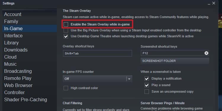 เปิด Steam แล้วเลือก Steam > การตั้งค่า จากแถบเมนู ไปที่ ในเกม และยกเลิกการเลือก เปิดใช้งาน Steam Overlay ขณะอยู่ในเกม