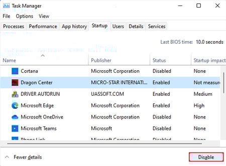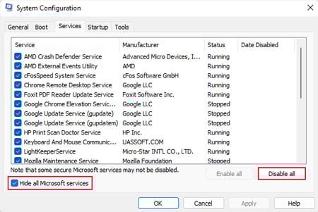 เปิด Run โดยกด Win + R พิมพ์ msconfig แล้วกด Enter เพื่อเปิด System Configuration ไปที่แท็บ บริการ และเลือก ซ่อนบริการทั้งหมดของ Microsoft คลิกปิดใช้งานทั้งหมด จากนั้นคลิกนำไปใช้ ไปที่แท็บ เริ่มต้น แล้วคลิก เปิดตัวจัดการงาน เลือกโปรแกรมที่เปิดใช้งานทั้งหมด (ดูคอลัมน์สถานะ) แล้วคลิกปิดใช้งาน