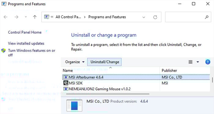 เปิด Run พิมพ์ appwiz.cpl แล้วกด Enter เพื่อเปิด โปรแกรมและคุณลักษณะ คลิก MSI Afterburner แล้วเลือก ถอนการติดตั้ง/เปลี่ยนแปลง ทำตามคำแนะนำบนหน้าจอเพื่อถอนการติดตั้งแอป ดาวน์โหลดเวอร์ชันล่าสุดของ MSI Afterburner จากเว็บไซต์อย่างเป็นทางการ แยกและเรียกใช้ไฟล์ติดตั้ง ทำตามคำแนะนำบนหน้าจอ