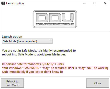 ดาวน์โหลดไดรเวอร์ล่าสุดสำหรับกราฟิกการ์ดของคุณ ตัดการเชื่อมต่ออินเทอร์เน็ตของคุณและเรียกใช้โปรแกรมถอนการติดตั้งไดรเวอร์จอแสดงผล หากคุณไม่มีแอป คุณต้องดาวน์โหลดจากหน้า GitHub และ ดึงออกก่อน หากคุณเปิด DDU เป็นครั้งแรก เมนูตัวเลือกจะปรากฏขึ้น ทำเครื่องหมายที่ กล่องโต้ตอบเปิดใช้งาน Safe Mode แล้วคลิก ปิด จากนั้นเปิดแอปพลิเคชันอีกครั้ง ในหน้าต่างตัวเลือก Launch ให้ตั้งค่าช่องแบบเลื่อนลงเป็น Safe Mode แล้วคลิก Reboot to Safe Mode
