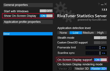 เปิดเซิร์ฟเวอร์สถิติ RivaTuner คลิกที่ไอคอนบนถาดระบบ สลับเปิด แสดงบนหน้าจอ และ รองรับการแสดงผลบนหน้าจอ