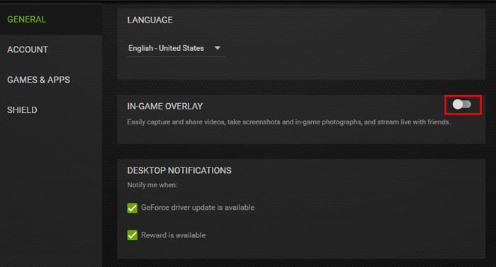 Open GeForce Experience คลิกที่ไอคอน การตั้งค่า (รูปเฟือง) และไปที่ ทั่วไป ปิด โอเวอร์เลย์ในเกม
