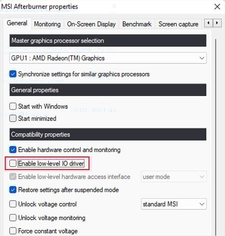 ใน MSI Afterburner ให้คลิกที่ การตั้งค่า ยกเลิกการเลือก เปิดใช้งานไดรเวอร์ IO ระดับต่ำ ภายใต้คุณสมบัติความเข้ากันได้ จากนั้นคลิกตกลง