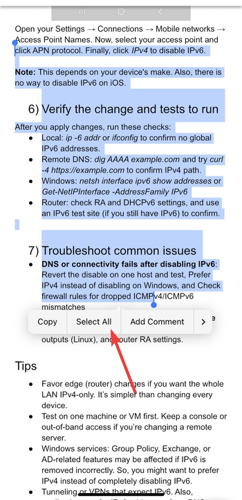 At sa mga mobile na aparato tulad ng iPhone at Android, kailangan mo lamang i-tap at hawakan ang screen at piliin ang piliin ang lahat upang piliin ang buong dokumento, kabilang ang mga talahanayan at mga imahe.