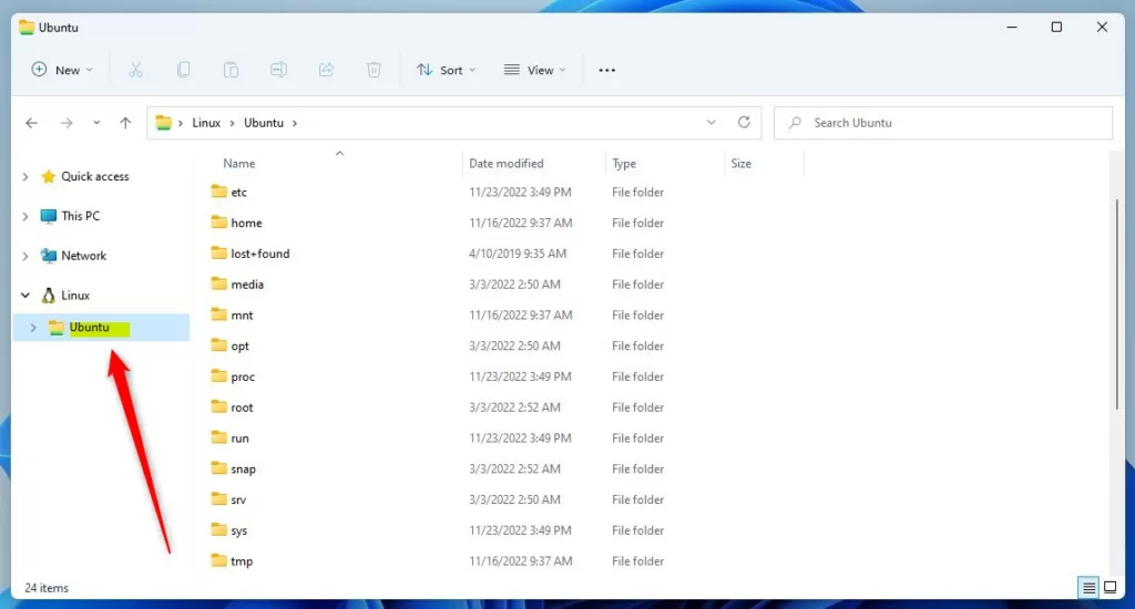 Tulad ng nabanggit sa itaas, bilang default, kapag pinagana mo ang Windows Subsystem para sa Linux at na-install ang Ubuntu, awtomatikong idinaragdag ang folder ng Ubuntu sa navigation pane sa File Explorer para sa madaling pag-access.