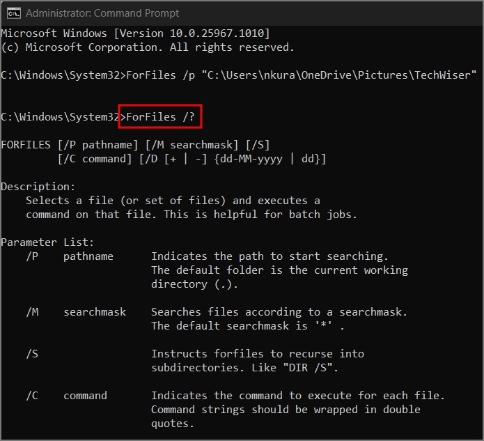 Nếu muốn tìm hiểu chi tiết hơn về từng lệnh, bạn có thể sử dụng lệnh’ForFiles/?'(không có dấu ngoặc kép).