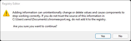 Khi được nhắc xác nhận, hãy nhấp vào Nút “Có“. Hành động này sẽ hợp nhất các khóa đăng ký Chrome.