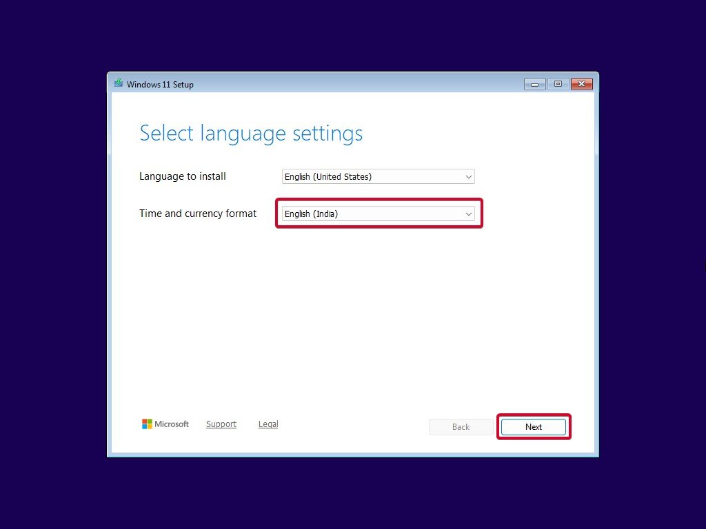 Chọn Ngôn ngữ để cài đặt, Định dạng thời gian và tiền tệ và Bàn phím hoặc phương thức nhập; sau đó nhấp vào nút Tiếp theo.