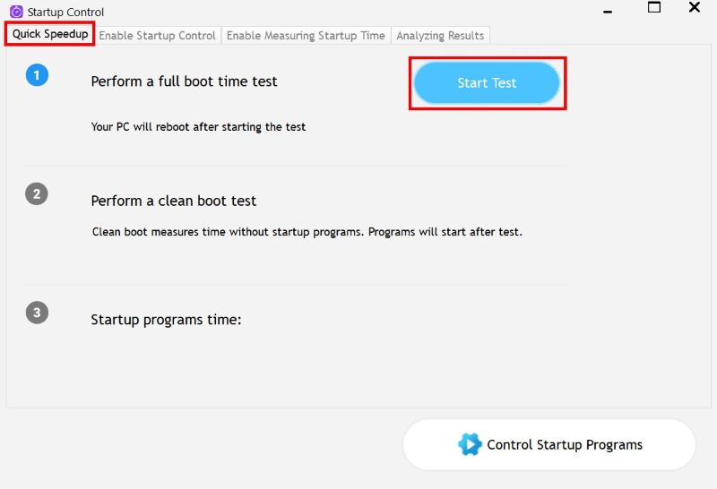 Đảm bảo bạn đang ở trong tab “Tăng tốc nhanh“và nhấp vào nút “Bắt đầu kiểm tra“tiếp theo để “Thực hiện kiểm tra toàn bộ thời gian khởi động”.