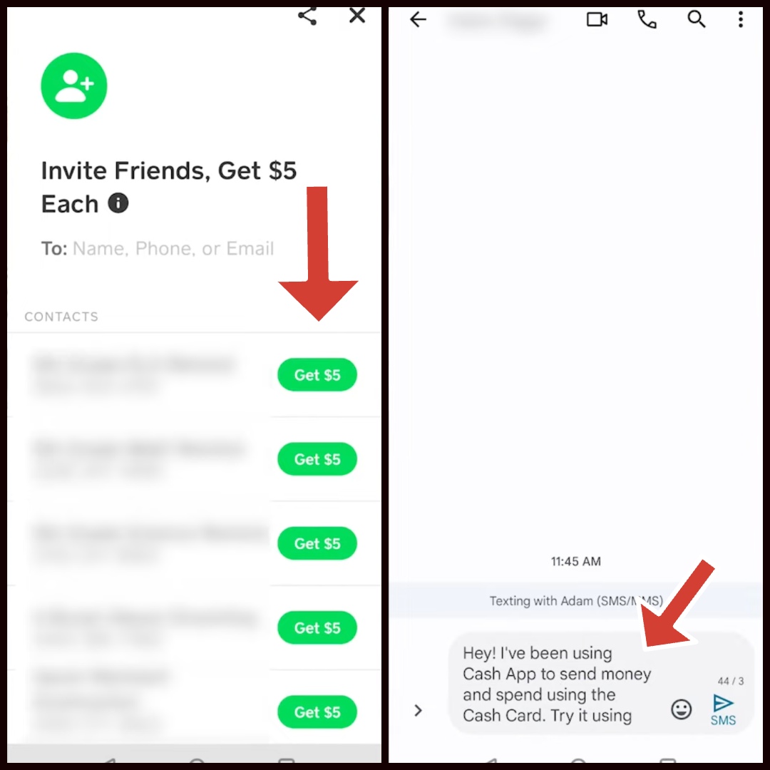Nếu bạn đã kết nối danh bạ của mình với Cash Ứng dụng, bạn sẽ thấy chúng. Bạn có thể chia sẻ liên kết giới thiệu của mình bằng cách nhấn vào Nhận $X hoặc gửi $Cashtag của bạn qua tin nhắn văn bản hoặc mạng xã hội.