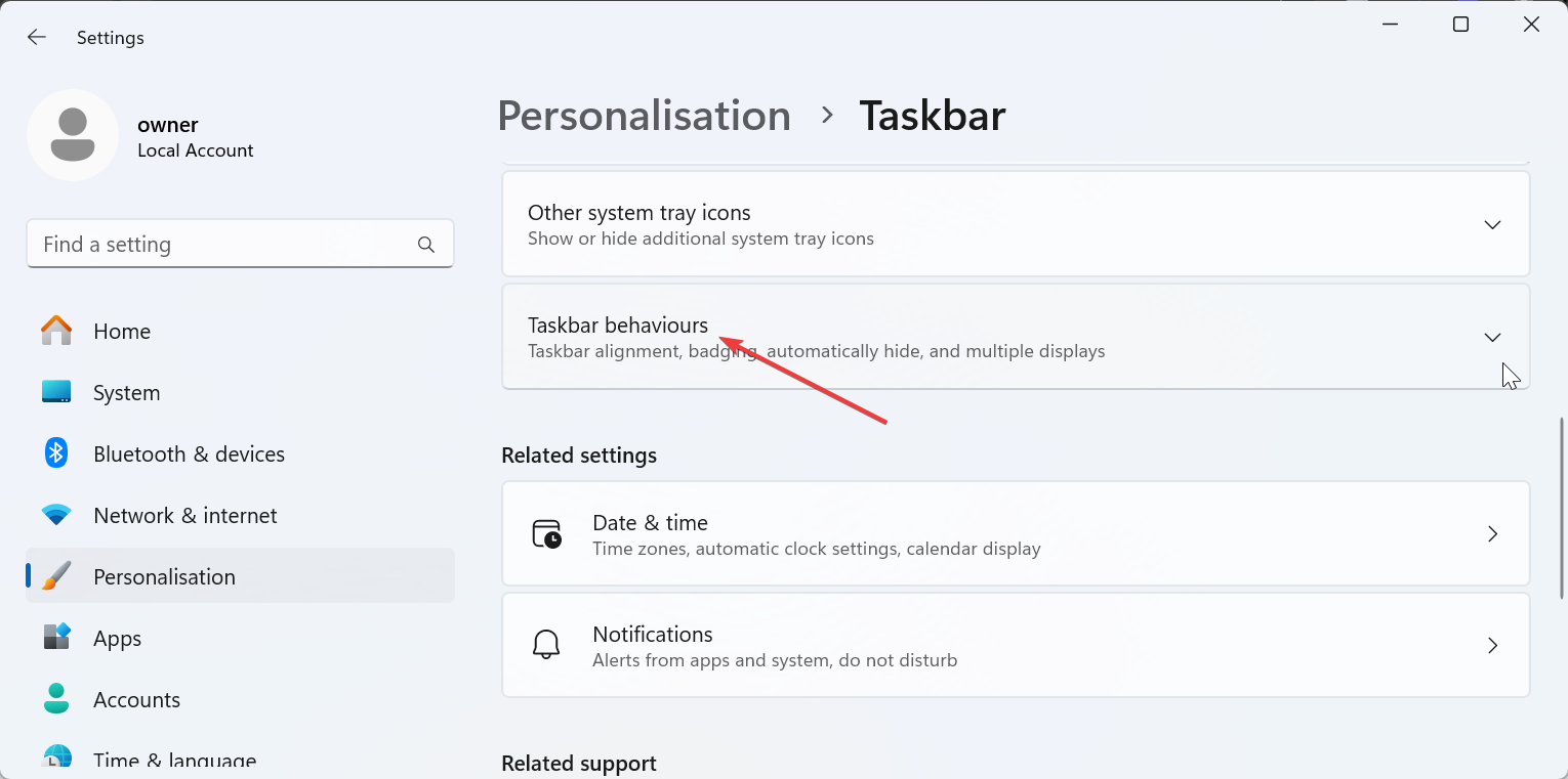 Nếu thiết bị của bạn không tự động chuyển đổi hoặc bạn chỉ thích một bố cục máy tính bảng cố định, có các tùy chọn thủ công để mô phỏng chế độ máy tính bảng. Đầu tiên là bật Thanh tác vụ được tối ưu hóa cho cảm ứng bằng cách đi tới Cài đặt > Cá nhân hóa > Hành vi của thanh tác vụ. Bật Tối ưu hóa thanh tác vụ cho tương tác chạm để phóng to biểu tượng và thêm khoảng cách bổ sung cho thao tác nhập bằng thao tác chạm, mô phỏng chế độ máy tính bảng.