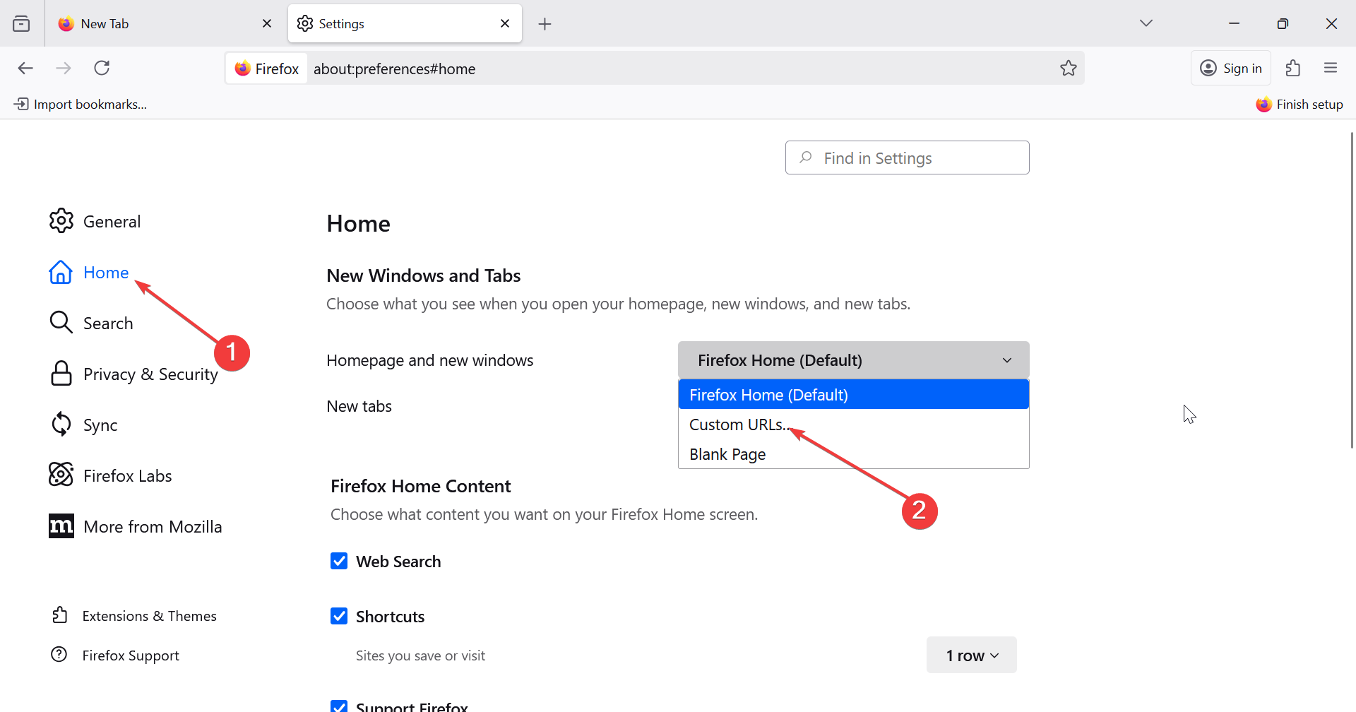 Nhấp vào ba đường ngang ở góc trên bên phải của Firefox và chọn Cài đặt để mở cửa sổ tùy chọn chính. Bây giờ, chọn Trang chủ ở thanh bên trái. Tại đây, bạn có thể xem lại các biện pháp kiểm soát dành cho trang chủ, trang tab mới và hoạt động khởi động.