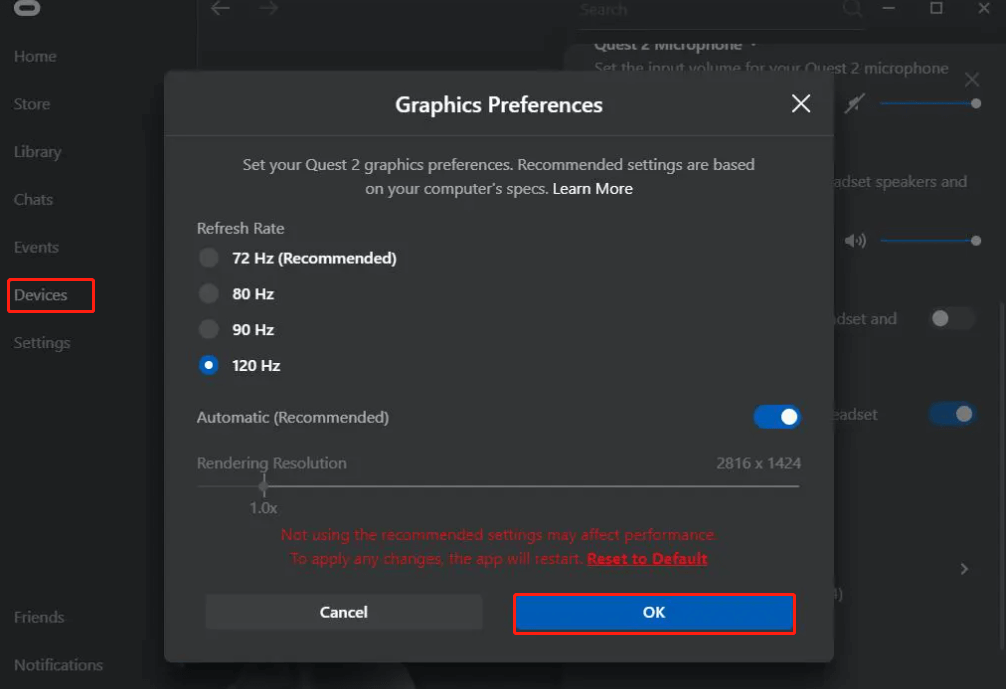 Lưu ý: Tốc độ làm mới ban đầu của Quest 2 được giới hạn ở 72 Hz nhưng các phiên bản chương trình cơ sở mới hơn hỗ trợ tốc độ cao hơn. Việc điều chỉnh điều này cũng có thể ảnh hưởng đến hiệu suất của Air Link nếu bạn chuyển đổi sau này.