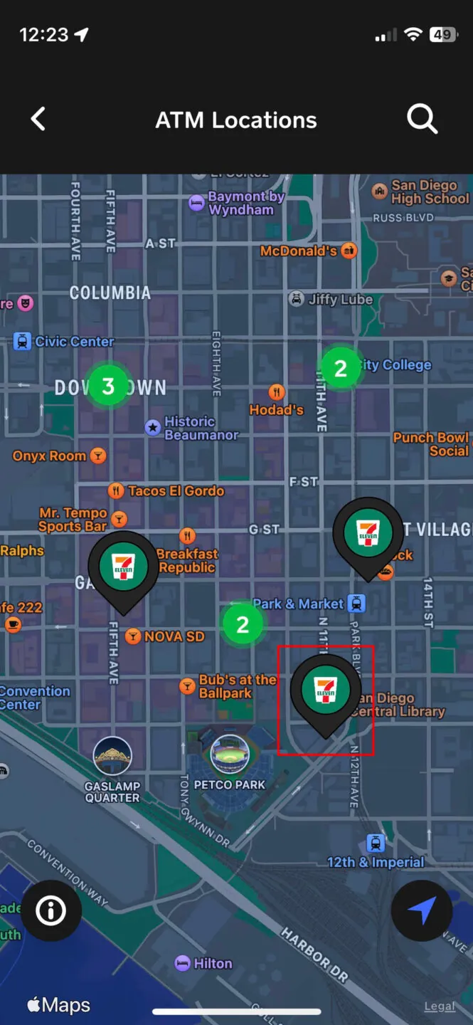 Một số địa điểm có máy ATM trong mạng lưới (thường là Allpoint hoặc MoneyPass). Sử dụng công cụ định vị trong ứng dụng và kiểm tra phí trên máy trước khi rút tiền.