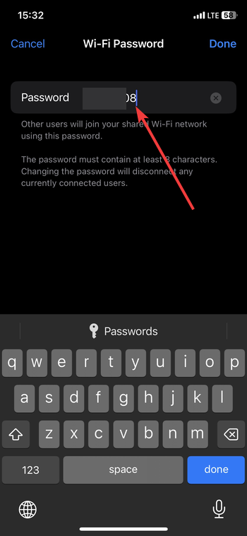 Nhấn vào Mật khẩu Wi-Fi để đặt mật khẩu an toàn. Cụm mật khẩu duy nhất giúp bảo vệ dữ liệu của bạn. Bạn có thể điều chỉnh tên thiết bị của mình trong Cài đặt → Cài đặt chung → Giới thiệu, thao tác này sẽ thay đổi tên phát sóng của điểm phát sóng.