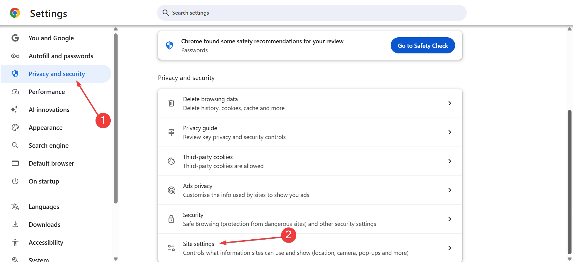 Mở Chrome. Nhấp vào ba dấu chấm. Chọn Cài đặt. Đi tới Quyền riêng tư và bảo mật. Mở Cài đặt trang web.