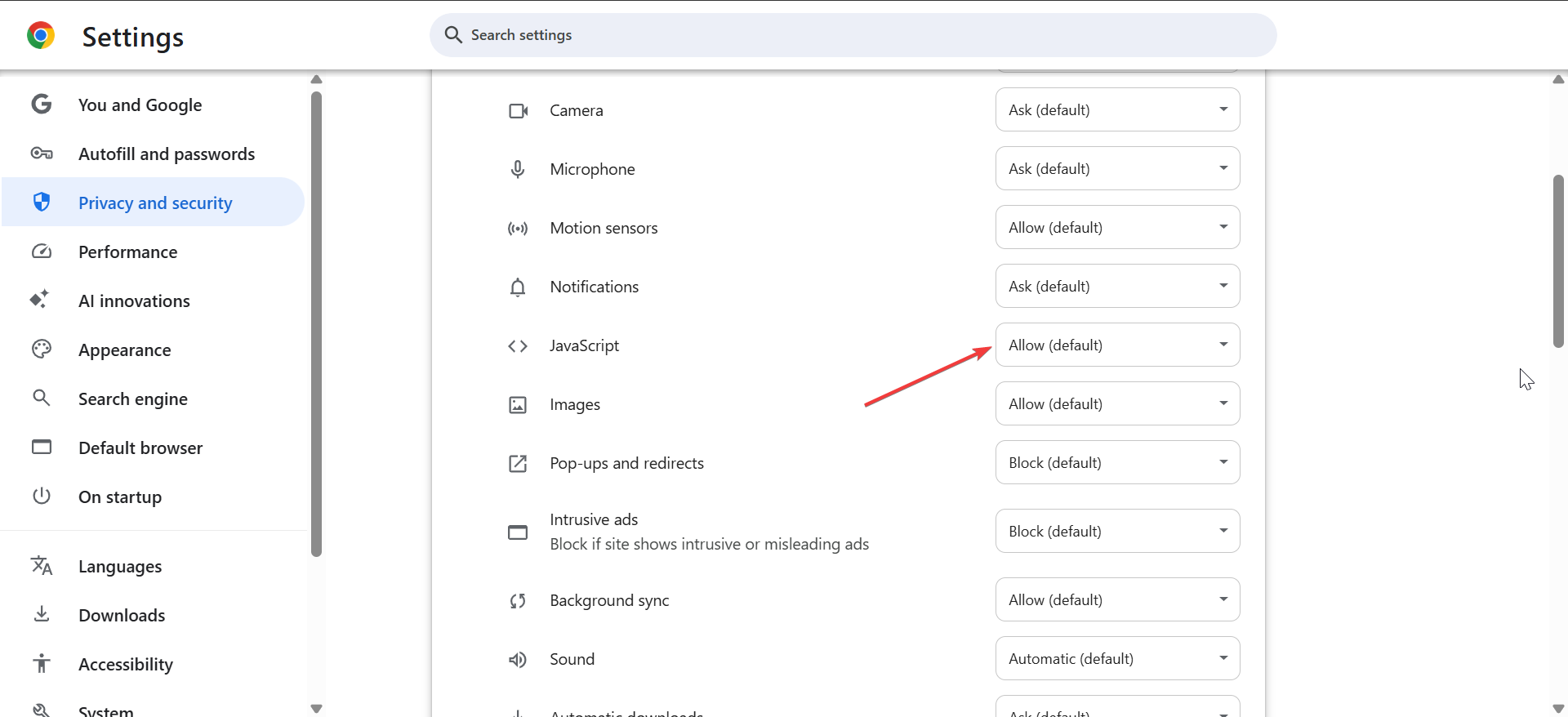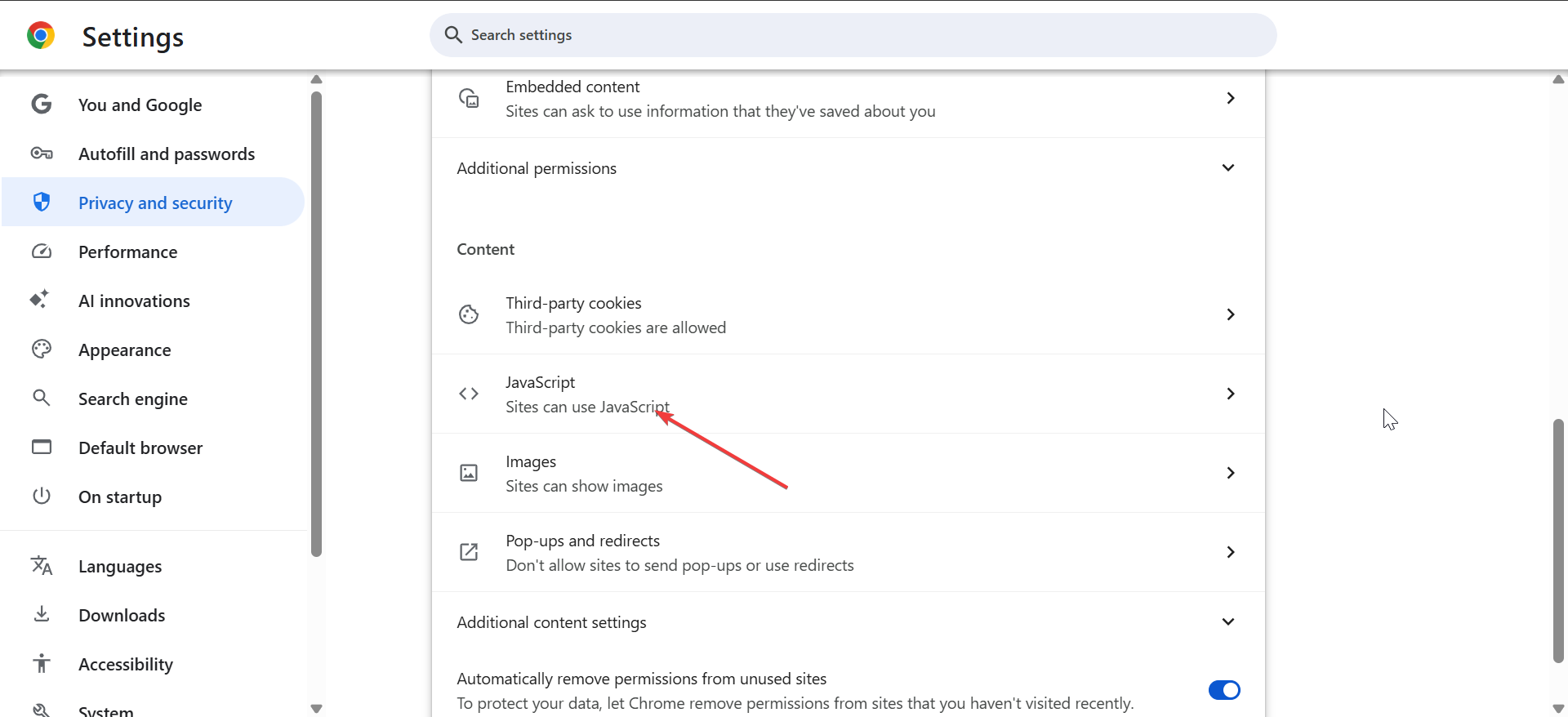 Các trang web đôi khi hiển thị thông báo cập nhật JavaScript vì JavaScript bị tắt. Bạn có thể kiểm tra cài đặt này trong quyền của trang web Chrome.