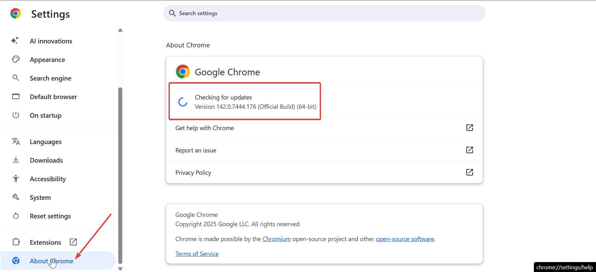 Chrome tự động kiểm tra các bản cập nhật nhưng bạn có thể kích hoạt cập nhật theo cách thủ công. Cập nhật sẽ làm mới công cụ JavaScript của bạn.