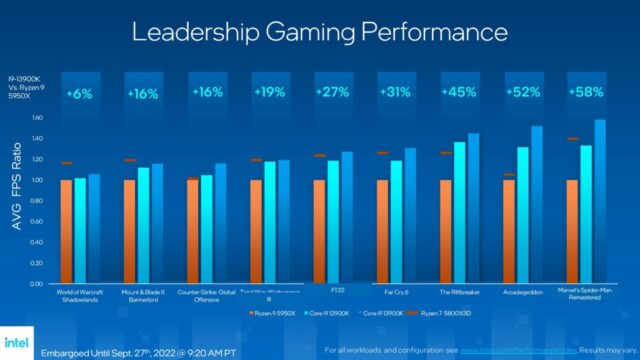Không giống như chip trước đây, có xung nhịp thấp hơn nguồn của nó CPU, các phiên bản Zen 4 được báo cáo là có tốc độ xung nhịp tương tự nhau. Đối với ngữ cảnh, xung nhịp cơ sở 3,4 GHz của 5800X3D chậm hơn 400 MHz so với 5800X. Xung nhịp boost 4,5GHz của nó chậm hơn 200MHz. Bất chấp những xung nhịp thấp này, CPU vẫn có thể chiếm ưu thế trong các điểm chuẩn chơi game. Intel thậm chí còn ngượng ngùng đưa nó vào các slide giới thiệu Raptor Lake (bên dưới), nơi có thể thấy nó đánh bại các CPU mới nhất của mình trong một số trò chơi.