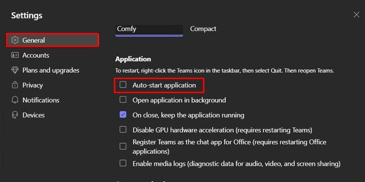 Chọn Chung từ bảng điều khiển bên trái. Bỏ chọn hộp Ứng dụng tự khởi động. Thao tác này sẽ tắt chức năng tự khởi động của ứng dụng trong lần khởi động lại tiếp theo.