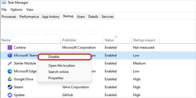 Giống như hầu hết các ứng dụng mới được cài đặt, Microsoft Teams được đặt để khởi chạy khi khởi động theo mặc định. Mặc dù hữu ích nhưng các ứng dụng khởi động có thể làm chậm đáng kể thời gian khởi động Windows của bạn. Các ứng dụng như vậy tiếp tục chạy trong nền và tiêu tốn tài nguyên máy tính của bạn cho đến khi bạn thoát khỏi chính ứng dụng đó.
