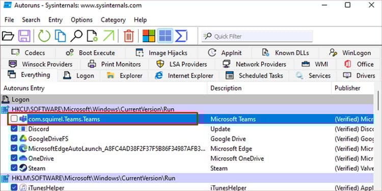 Ứng dụng Autorun là một ứng dụng đã được Microsoft xác minh cho phép bạn định cấu hình các chương trình được đặt để chạy tự động khi khởi động. Đây là một chương trình mạnh mẽ có thể quản lý các quy trình khởi động, bao gồm các quy trình hệ thống và ứng dụng của bên thứ ba. Bạn có thể tải xuống ứng dụng này từ trang web của Microsoft và sử dụng nó để tắt Teams khi khởi động. Đây là cách bạn thực hiện: