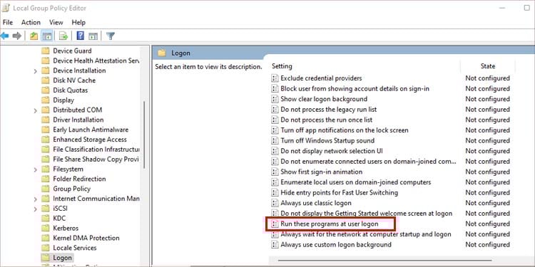 Đi tới Mẫu quản trị > Hệ thống > đăng nhập. Nhấp đúp vào Chạy các chương trình này khi người dùng đăng nhập và chọn Chưa định cấu hình hoặc Đã tắt.