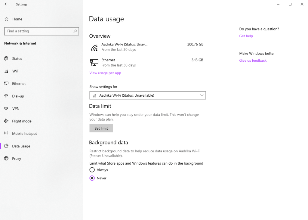 Mặc dù không có nhiều tính năng như các ứng dụng của bên thứ ba nhưng công cụ này hiển thị khá tốt ứng dụng nào đang ngốn nhiều dữ liệu nhất. Thêm vào đó, việc biết rõ lượng dữ liệu bạn đang sử dụng hàng tháng sẽ cho phép bạn bật cài đặt kết nối được đo lường trên một mạng cụ thể, nếu cần. Như bạn có thể đã đoán, kết nối được đo lường là một tính năng hữu ích để hạn chế mức sử dụng dữ liệu khi sử dụng dữ liệu di động.